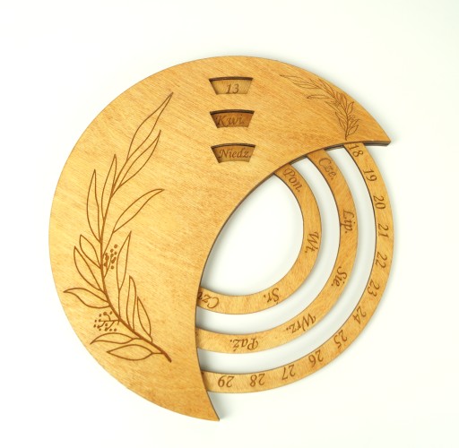 Elegancka forma drewnianego koła z grawerowanym motywem zegarów świetnie sprawdzi się jako dekoracja wnętrza