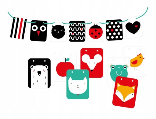 „Co widzę?” to kartonowe książeczki harmonijki z wyraźnymi, kontrastowymi ilustracjami. Oglądajcie je razem! Obrazki stopniowo stają się bardziej skomplikowane i kolorowe. Opowiadajcie o tym, co widać na ilustracjach - maluchy uwielbiają słuchać waszego głosu. Duże dwustronne karty kontrastowe możecie wykorzystać jako plansze do pokazywania lub stworzyć z nich efektowną girlandę, która pomoże w ćwiczeniu wzroku malucha i może stać się ozdobą dziecięcego pokoju.