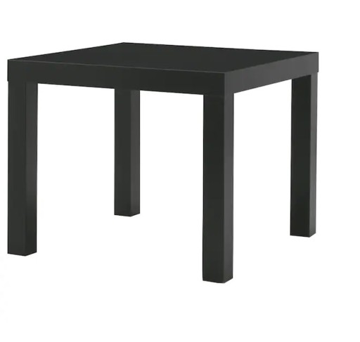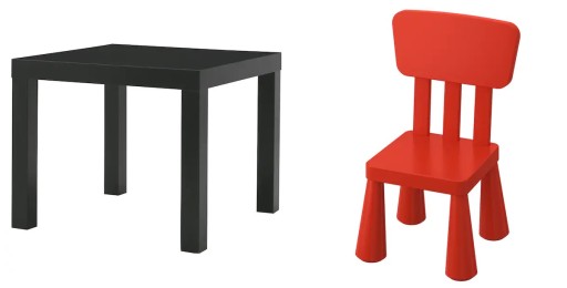 Zestaw IKEA Lack czarny stolik o wymiarach 55 cm x 55 cm + krzesełko mammut w kolorze czerwonym.
