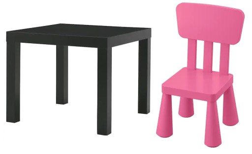 Zestaw IKEA Lack czarny stolik o wymiarach 55 cm x 55 cm + krzesełko mammut w kolorze różowym.