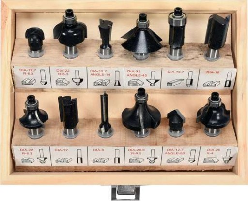 Frezy do drewna kpl. 12 sztuk o średnicy trzpienia 8 mm. Służą do frezowania przy użyciu górnowrzecionowej frezarki w naturalnym drewnie, sklejkach i płytach wiórowych . Przydatne w każdym domowym warsztacie.
