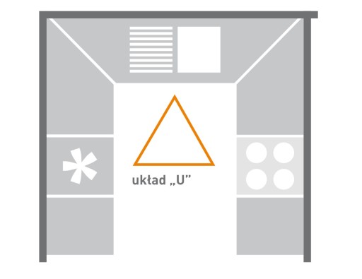 Kształt kuchennej zabudowy i układ stref uzależniony jest w dużej mierze od wymiarów i układu wnętrza