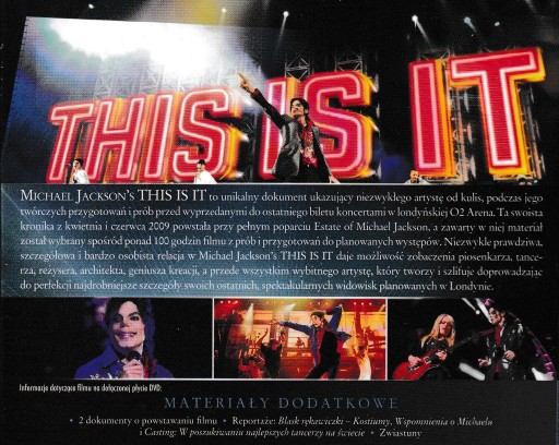Michael Jacksons THIS IS IT to unikalny dokument ukazujący niezwykłego artystę od kulis, podczas jego twórczych przygotowań i prób przed wyprzedanymi do ostatniego biletu koncertami w londyńskiej O2 Arena. Ta swoista kronika z kwietnia i czerwca 2009 powstała przy pełnym poparciu Estate of Michael Jackson, a zawarty w niej materiał został wybrany spośród ponad 100 godzin filmu z prób i przygotowań do planowanych występów. Niezwykle prawdziwa, szczegółowa i bardzo osobista relacja w Michael Jacksons THIS IS IT daje możliwość zobaczenia piosenkarza, tancerza, reżysera, architekta, geniusza kreacji, a przede wszystkim wybitnego artystę, który tworzy i szlifuje doprowadzając do perfekcji najdrobniejsze szczegóły swoich ostatnich, spektakularnych widowisk planowanych w Londynie