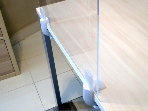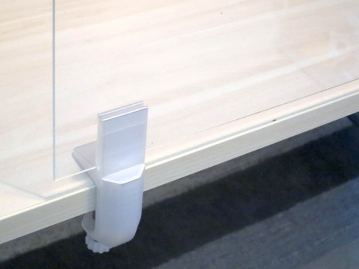 - bardzo prosty i szybki montaż - przykręcamy bezinwazyjnie uchwyty do blatu a następnie wsuwamy plexi w szczeliny dwóch uchwytów, które ściskają plexi i tworzą jej podstawę.