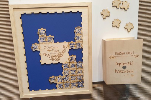 Ramka do księgi gości “puzzle” to rozszerzona opcja naszej księgi gości w formie puzzli. Goście po złożeniu dedykacji mogą od razu tworzyć układankę i przyklejać elementy puzzli w ramce. Do wyboru macie 3 wielkości ramek i aż 9 opcji pojemności puzzli, w zależności od ilości Waszych gości. Po wybraniu ramki nie zapomnijcie dodać do koszyka odpowiednią ilość puzzli (dostępne w naszych pozostałych ofertach).