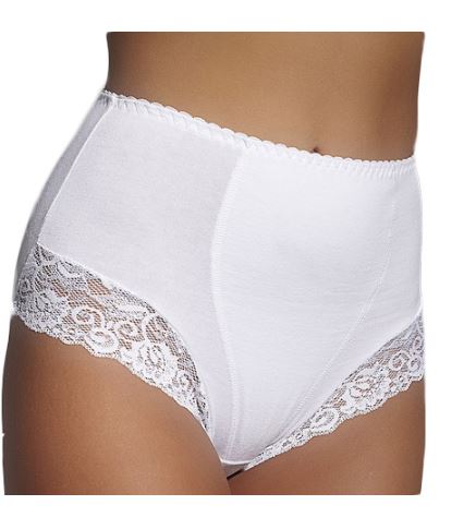 ELA – bawełniane figi modelujące. Dzięki podwójnej warstwie dzianiny wszytej z przodu delikatnie spłaszczają brzuch. Nogawki w przedniej części wykończone miękką, niedrażniącą koronką.