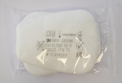 Filtr 3M™ 5935 P3R chroni przed cząstkami substancji ciekłych i stałych. Pasują do półmasek i masek pełnych 3M™ serii 6000 oraz 7000.