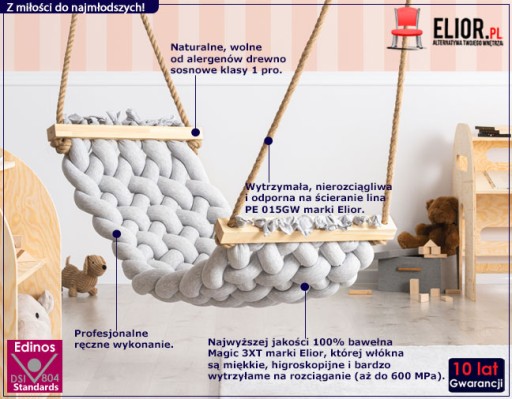 Ponieważ projektanci marki Elior sami są rodzicami, przy tworzeniu hamaku Malis dołożyli wszelkich starań, aby wyróżniał się on jakością na najwyższym poziomie. Bezpieczeństwo najmłodszych użytkowników stało się punktem przewodnim. Hamak w całości wykonany został ze starannie wyselekcjonowanych, wysokogatunkowych materiałów. Miękkie i niezwykle stylowe siedzisko to 100% bawełna Magic 3XT marki Elior. Materiał ten wyróżnia się ponadprzeciętną odpornością na uderzenia, naciąganie czy długotrwałe obciążenie. Do tego jest odporny na zabrudzenia oraz wilgoć. Zapewniamy Cię, że bawełna Magic 3XT marki Elior nie uczula, zapewnia skórze przewiewność, łatwo się pierze i jest bardzo miła w dotyku. Jego wypełnienie to wysokogatunkowy puch syntetyczny wytworzony z odpowiednio ukształtowanych włókien poliestrowych, których zadaniem jest utrzymanie sprężystości i stworzenie szeregu komór powietrznych dbających o termikę. Włókna poliestrowe nie chłoną nadmiernie wilgoci i w kontakcie z wodą sprawują się dużo lepiej niż naturalny puch. Puch wykorzystany do stworzenia hamaku Malis wyróżnia się także wysoką sprężystością - aż 700 cuin. Całość utrzymuje się na grubych, wytrzymałych i odpornych na ścieranie linach przymocowanych do naturalnego drewna sosnowego. Dokładnie szlifowana powierzchnia materiału zabezpieczona została naturalnym impregnatem ochronnym, całkowicie wolnym od formaldehydu, który chroni przed zarysowaniem oraz przetarciem drewna. Dzięki temu jest dobrze tolerowane przez alergików oraz osoby wrażliwe i co najważniejsze - mają neutralny wpływ na zdrowie Twojego dziecka w przeciwieństwie do innych produktów konkurencji.