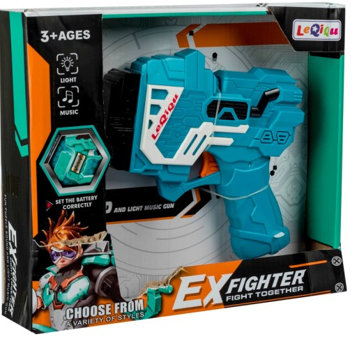 - Po naciśnięciu spustu, zabawka dźwiękiem imituje odgłos walki oraz świeci