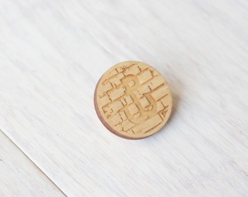 Drewniana wpinka z drewna brzozowego z wygrawerowanym znakiem powstania warszawskiego.