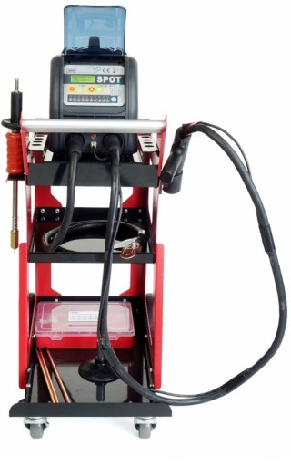 Sterowany mikroprocesorem SPOTTER (ZGRZEWARKA) do wyciągania łatania i rozgrzewania elektrodą węglową blach. Maksymalny prąd zgrzewania 3000 A. Zasilanie 400V. Moc maksymalna 10 kW.