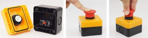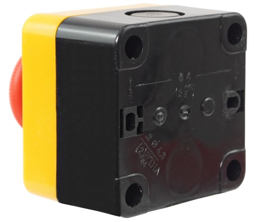 Kaseta sterownicza żółta, z przyciskiem awaryjnym czerwonym- STOP - grzybek, dłoniowy, z dławikiem PG 13,5, w obudowie.