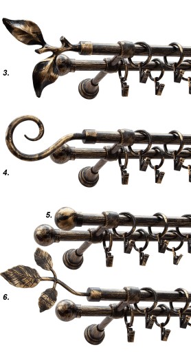 Tanie karnisze z kolekcji motyw kute wyglądem nie różnią się od karniszy metalowych. Karnisz wykonany jest ze stali pokrytej wysokiej jakości laminatem odpornym na zarysowania. Końcówki i wsporniki wykonane są z wysokogatunkowego tworzywa PCV.