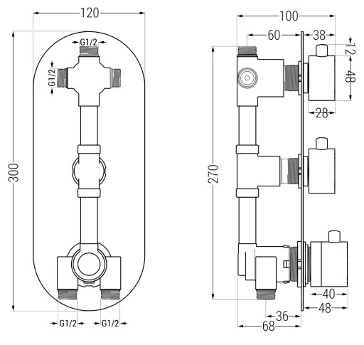 - Podłączenie: 2x wejście 1/2" oraz 3x wyjście 1/2"