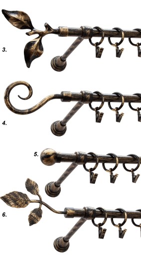 Tanie karnisze z kolekcji motyw kute wyglądem nie różnią się od karniszy metalowych. Karnisz wykonany jest ze stali pokrytej wysokiej jakości laminatem odpornym na zarysowania. Końcówki i wsporniki wykonane są z wysokogatunkowego tworzywa PCV.