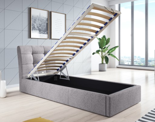 - Łóżko wyposażone jest w duży pojemnik na pościel - solidna drewniana konstrukcja, podnośniki sprężynowe