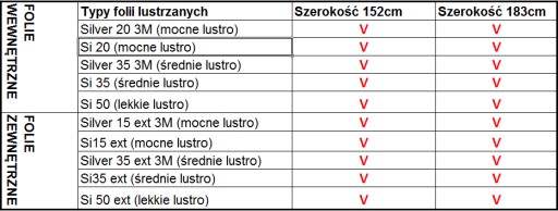 ZESTAWIENIE TYPÓW I SZEROKOŚCI FOLII LUSTRZANYCH DOSTĘPNYCH NA NASZYCH AUKCJACH
