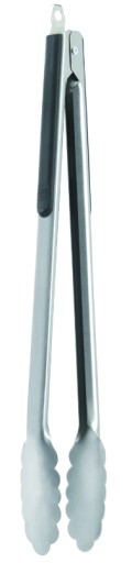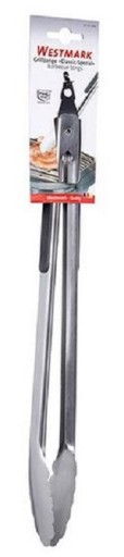 Szczypce do grillowania. Składają się z dwóch części złączonych ze sobą. Na rączkach część gumowa ułatwiająca trzymanie. Posiada uchwyt do powieszenia.