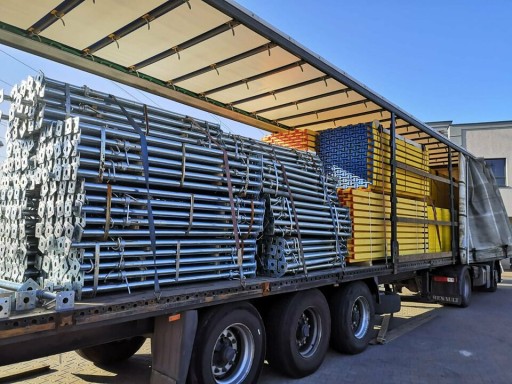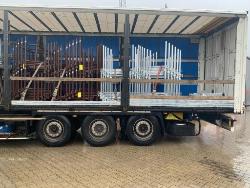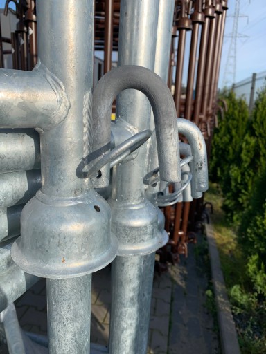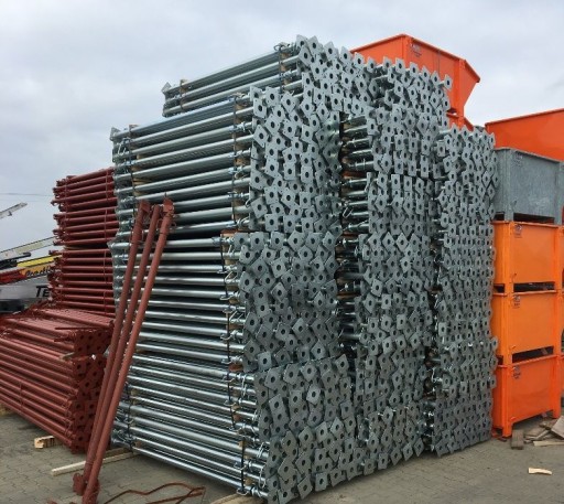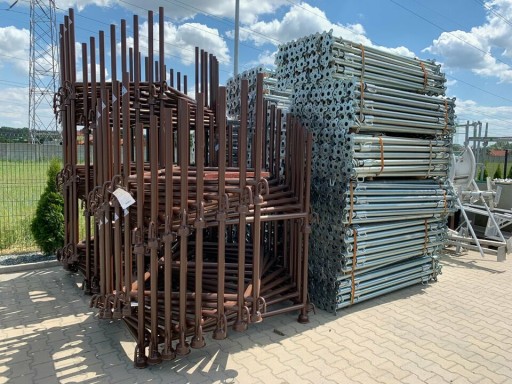 Nowy stojak magazynowo-transportowy ze stali - ocynkowany. Stojak służy do składowania, magazynowania na placu i transportowania elementów rusztowań, dźwigarów, podpór budowlanych i innych materiałów.