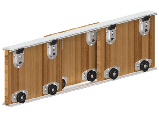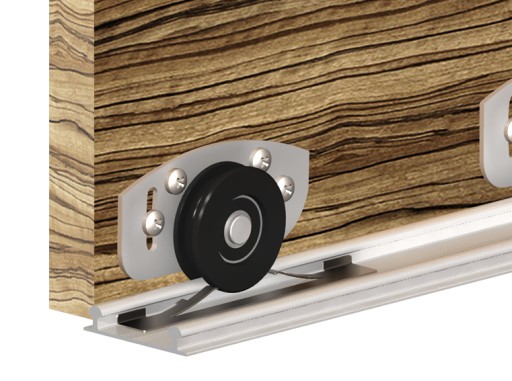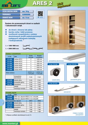 Komplet okuć do szaf przesuwnych ARES 2. ciężar skrzydła drzwi do 70 kg, grubość drzwi min. 16 mm., prowadnica: aluminiowa, do drzwi z drewna lub płyty, bardzo cichy i lekki przesuw, możliwość uzupełnienia o zestaw listew