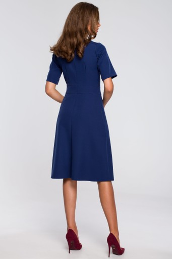 ▶ Model ten charakteryzuje się subtelnym, trapezowym dołem, który dzięki podwójnej warstwie (z podszewką) dodaje struktury i lekkości. Krótkie rękawy kreacji są idealnym wyborem dla tych, którzy szukają eleganckiego, ale niezobowiązującego wyglądu.