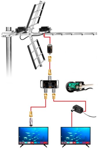 Kompletny zestaw antenowy do podłączenia dwóch telewizorów, wszystkie komponenty są dobrane przez doświadczonych instalatorów gwarantując niezakłócony odbiór sygnału.