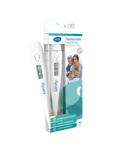 Termometr elektroniczny MediTemp Sanity służy do mierzenia temperatury dla całej rodziny. Jest tańszą alternatywą dla termometru bezdotykowego i wygodniejszą, szybszą, a także bezpieczniejszą dla termometru szklanego. Można nim mierzyć temperaturę doustnie, rektalnie oraz pod pachą. W przypadku pomiaru doustnego i rektalnego przybliżony czas wynosi 40 sekund, a w przypadku pomiaru pod pachą ok. 1 minuty. Sygnał dźwiękowy oznacza koniec pomiaru. Termometr automatycznie zapisuje ostatni wynik i ma wskaźnik wymiany baterii na wyświetlaczu.