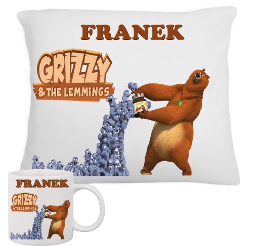 KUBEK + PODUSZKA GRIZZY I LEGMINGI Z BOHATERAMI + IMIĘ DZIECKA