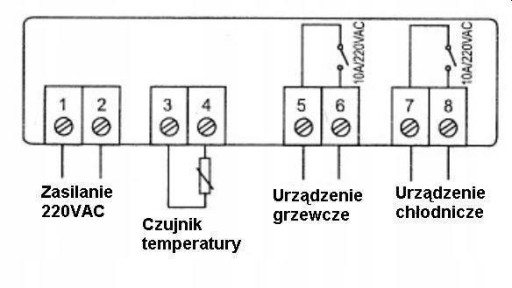 - Chłodzenia - w tym trybie przekaźnik włączony jest do momentu, gdy temperatura nie spadnie do wartości zadanej