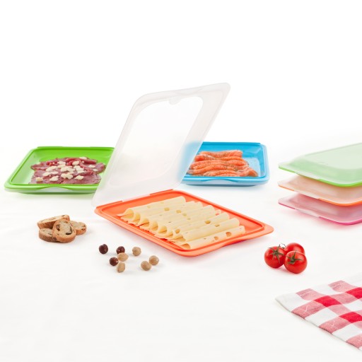 Pojemnik jest płaski dzięki czemu nie zajmuje dużo miejsca w lodówce a jego zdejmowana pokrywa umożliwia nam serwowanie wędlin od razu na stole.