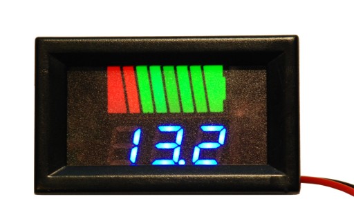 Miernik naładowania baterii, akumulatora - woltomierz panelowy, 12V. Miernik wskazuje w sposób graficzny poziom naładowania baterii, wyświetla również wskazanie napięcia w woltach. Przykładowe wskazania zamieszczone są na zdjęciach. Miernik działa dla 12V - dla tego zakresu wyświetla graficznie.