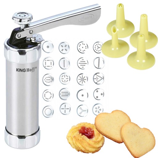 Dzięki tej maszynce przygotujesz pyszne, domowe wypieki w rozmaitych kształtach i smakach! Urządzenie pozwala na formowanie ciasteczek oraz na dekorowanie tortów kremem. Maszynka jest łatwa w użyciu, wystarczy nałożyć do szprycy masę, którą chcemy dekorować i nacisnąć. Wykonana jest z metalu, łatwa w utrzymaniu czystości. Posiada 20 metalowych końcówek do wyrobu ciastek, oraz 4 do dekoracji kremem.