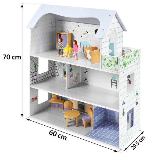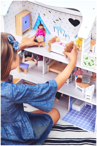 Ten piękny trzypiętrowy drewniany domek dla lalek jest w pełni wyposażony oraz posiada duże przestrzenne pomieszczenia, w których bez przerwy można przestawiać piękne drewniane mebelki i akcesoria.