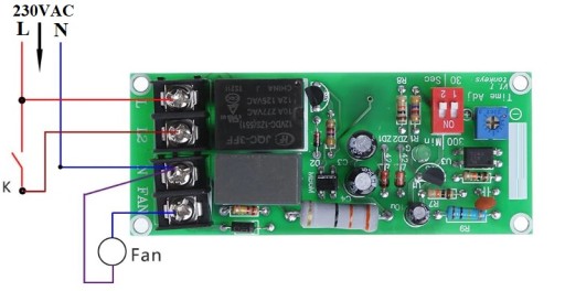 Moduł bardzo często używany w łazienkowych wentylatorach. Wystarczy podłączyć razem z włącznikiem światła w łazience uzyskując efekt przedłużonej pracy wentylatora po wyłączeniu światła w łazience (należy pamiętać, że moduł wymaga osobnego zasilania 230V).