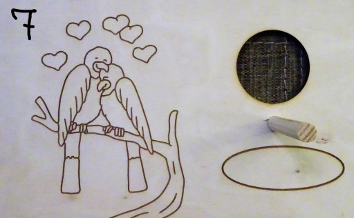 Wejście do budki ma kształt okręgu o średnicy 6 cm. (na życzenie może być inny) We wnętrzu domku znajduje się wyżłobione miejsce na gniazdko.