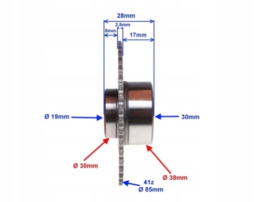 - Średnica zewnętrzna tulejki na zębatce z prawej i lewej strony: 30 mm i 38 mm