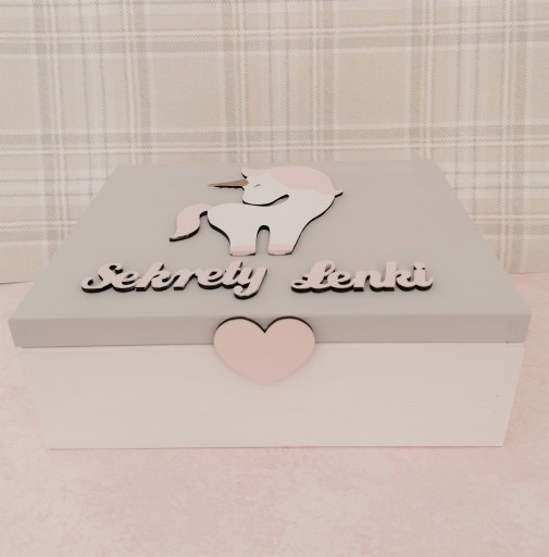 Elementem dekoracyjnym jest ręcznie malowany jednorożec i napis sekrety Lenki. Oczywiście w tym miejscu napiszemy każde wskazane w uwagach przez Ciebie imię.