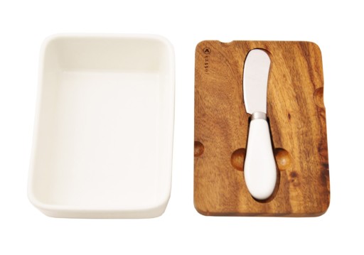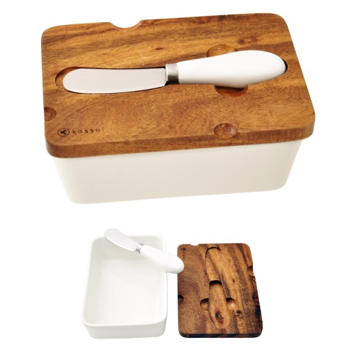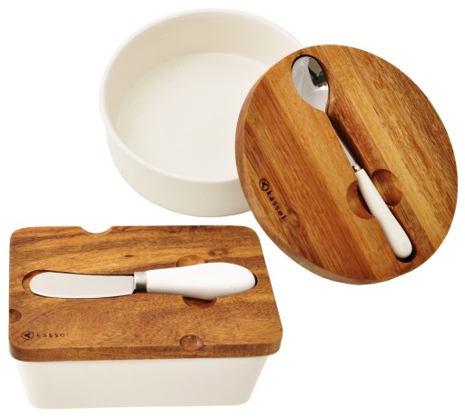 Estetycznie wykonane porcelanowe maselniczka i cukierniczka z pokrywkami z drewna akacjowego. Naturalne lite drewno zapewnia niepowtarzalny wzór każdej pokrywki. Nożyk do masła oraz łyżeczka wykonane są ze stali nierdzewnej i posiadają porcelanowe uchwyty.