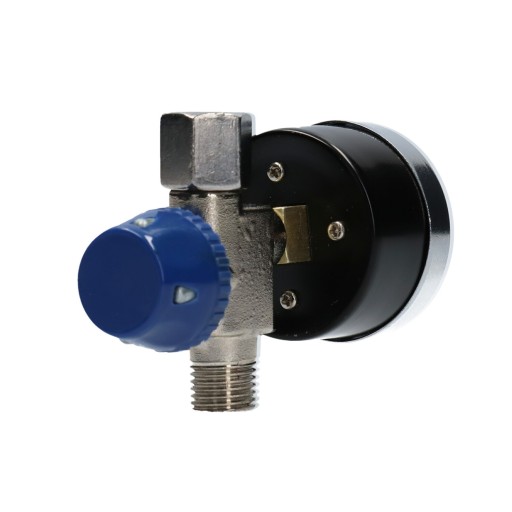 to urządzenie do montażu pod pistoletem lakierniczym w celu regulowania ciśnienia powietrza wpływającego do pistoletu lakierniczego. Regulator został wyposażony w pokrętło które umożliwia szybki i dokładne regulowanie dopływu powietrza oraz manometr który pokazuje aktualne ciśnienie. Jest to bardzo przydatne urządzenie, które oprócz informowania nas o aktualnym ciśnieniu roboczym niweluje skoki ciśnienia.