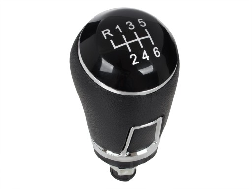 Schemat: 6 biegów + R, nakładka w kolorze czarnym z chromowym pierścieniem i białym schematem