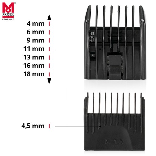 posiada 5 ustawień cięcia ostrza w zakresie od 0,7mm - 3mm + regulowana nasadka Guide Comb z 7 pozycjami strzyżenia 4mm, 6mm, 9mm, 11mm, 13mm, 16mm,18 mm + Dodatkowa stała nasadka 4,5 mm