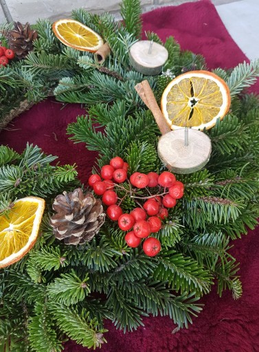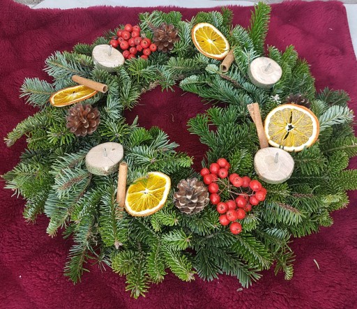 Wieniec wykonany jest z gałązek żywej jodły, zdobiony: suszoną pomarańczą, owocami dzikiej róży pachnącymi laskami cynamonu oraz małymi szyszkami sosnowymi. Dodatkowo są drewniane podstawki na świece.