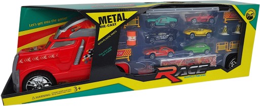 Tir z naczepą mierzy aż 55 cm długości i wykonany jest z solidnego błyszczącego plastiku. Wewnątrz naczepy znajdziemy 7 metalowych resoraków oraz 16 akcesori drogowych. W dachu ciężarówki umieszczono specjalną zjeżdżalnie po której suną samochodziki wypadając przez otwór w chłodnicy jak z wyrzutni !!!