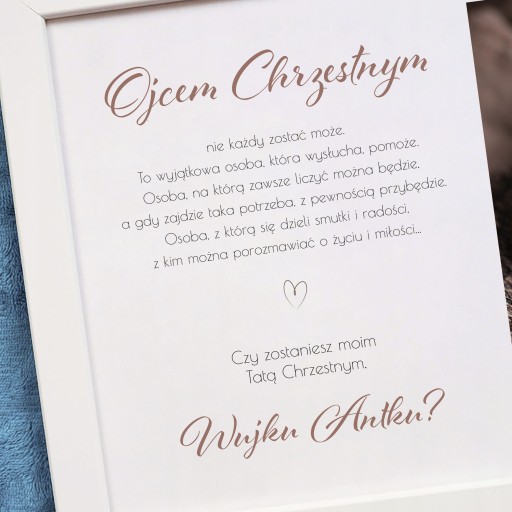 Na tej aukcji możesz kupić Prośbę o zostanie Ojcem Chrzestnym w rozmiarze 21 x 30 cm. Dodatkowy kolor dopasowywany jest do kolorystyki zdjęcia. Może być również wybrany przez Ciebie.