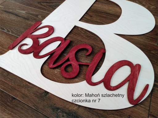 Przedmiotem sprzedaży jest Wielka pierwsza litera imienia o wysokości 50cm wycięta laserowo ze sklejki o grubości 4mm stan surowy -niemalowany oraz małe imię dziecka wycięte ze sklejki 3mm malowane bejcą + dekoracje (gwiazdki/chmurki/serca)