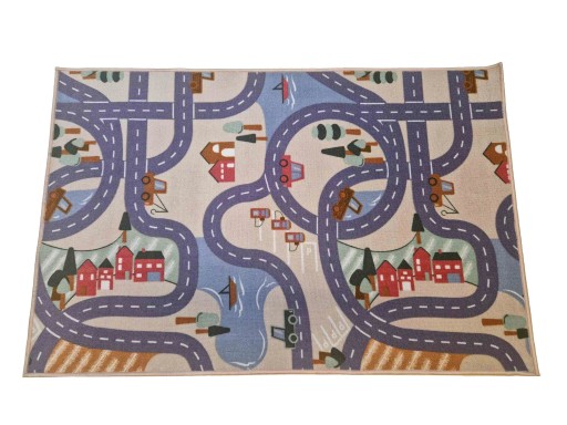 Wykładzina prezentująca uliczki, drogi oraz zabudowę. To przyjazne dla dzieci miejsce, na którym mogą swobodnie spędzać czas.