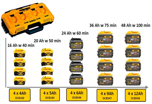 - Ładuje jednocześnie 4 akumulatory XR o różnych napięciach i pojemnościach 10,8 V / 12 V, 18 V i 54 V.