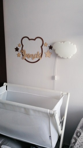Przedmiotem sprzedaży jest miś 35cm wycięty laserowo ze sklejki o grubości 4mm malowany bejcą, imię stan surowy - niemalowany oraz dekoracje (gwiazdki/chmurki/serca)