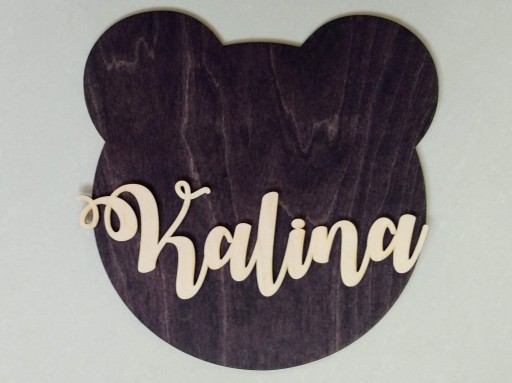 Przedmiotem sprzedaży jest miś 35cm wycięty laserowo ze sklejki o grubości 4mm malowany bejcą, imię stan surowy - niemalowane oraz dekoracje (gwiazdki/chmurki/serca)