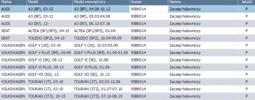 ZASTOSOWANIE W MODELACH WEDŁUG TABELI PODANEJ PRZEZ PRODUCENTA